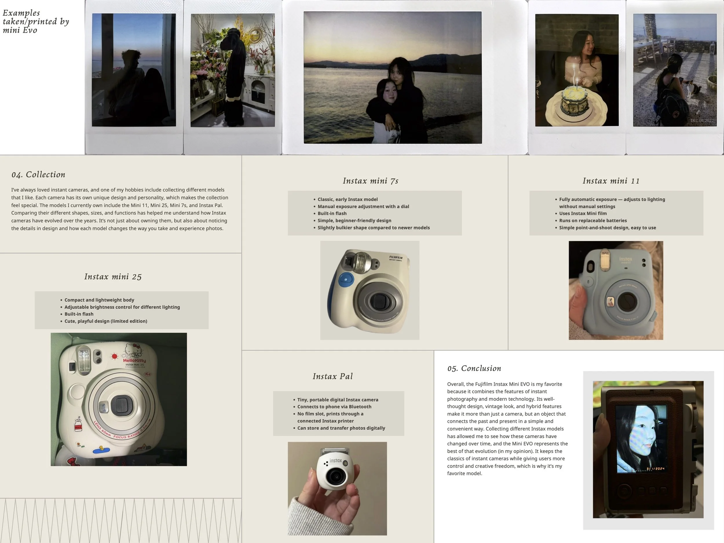 For the written content, I researched the origins of the instant camera and traced its major developments over time. I highlighted my favorite model, the Fujifilm Instax Mini Evo Hybrid Instant Camera, and explained in detail why I consider it as the best among the other models. The first page of the dossier introduces the camera and its key design features, while the second page showcases some of the other Fujifilm cameras I own and the major functions they share. I also included examples of photos I’ve taken and printed.