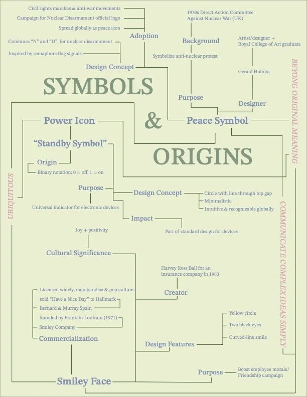 Prep: I began by listening to a podcast that explored the origins of three ubiquitous icons — the peace symbol, the smiley face, and the power icon. These are universal symbols that are universal but few know the meaning and design history behind. While listening, I downloaded the transcript into Google Docs to highlight key points I wanted to include in my diagram. From there, I organized the highlighted information into clear categories such as design concept, background, and symbolism.